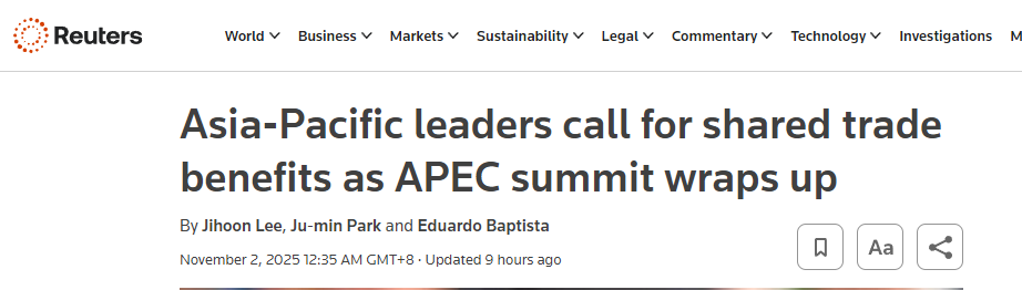 亚太经合组织(APEC)领导人非正式会议于10月31日至11月1日在韩国庆州举行。会议发表了《庆州宣言》。多家外媒报道称,此次会议凸显了亚太地区经济体对自由贸易的承诺。路透社报道称,在全球贸易秩序裂痕加深的背景下,APEC成员领导人在峰会结束时通过的联合声明中强调了贸易和共同利益的必要性。路透社网站截图报道,韩国《中央日报》报道称,庆州宣言反映了APEC领导人峰会的最终成果,并重申了成员领导人在保护主义抬头的背景下释放的承诺。韩国《中央日报》截图报道,《庆州宣言》不仅涵盖了2025年的优先事项:互联互通、创新和繁荣,还包括讨论贸易和投资、数字化转型和包容性增长。该宣言体现了所有成员在人工智能领域开展合作、应对亚太地区人口挑战的共同决心。特别是成员经济体一致同意“以市场化方式推动亚太地区经济一体化”的宣言,被认为是成功的。半岛电视台报道了峰会。报道援引新加坡辛里奇基金会贸易政策负责人黛博拉·埃尔姆斯的话说,成员国领导人能够就联合声明达成一致是“一件伟大的事情”。他表示,鉴于亚太经合组织经济体的不同立场,将任何商定的措辞纳入文件将是一项“具有挑战性的工作”。半岛电视台报道截图 来源:环球资讯编译 图文:杨卓英