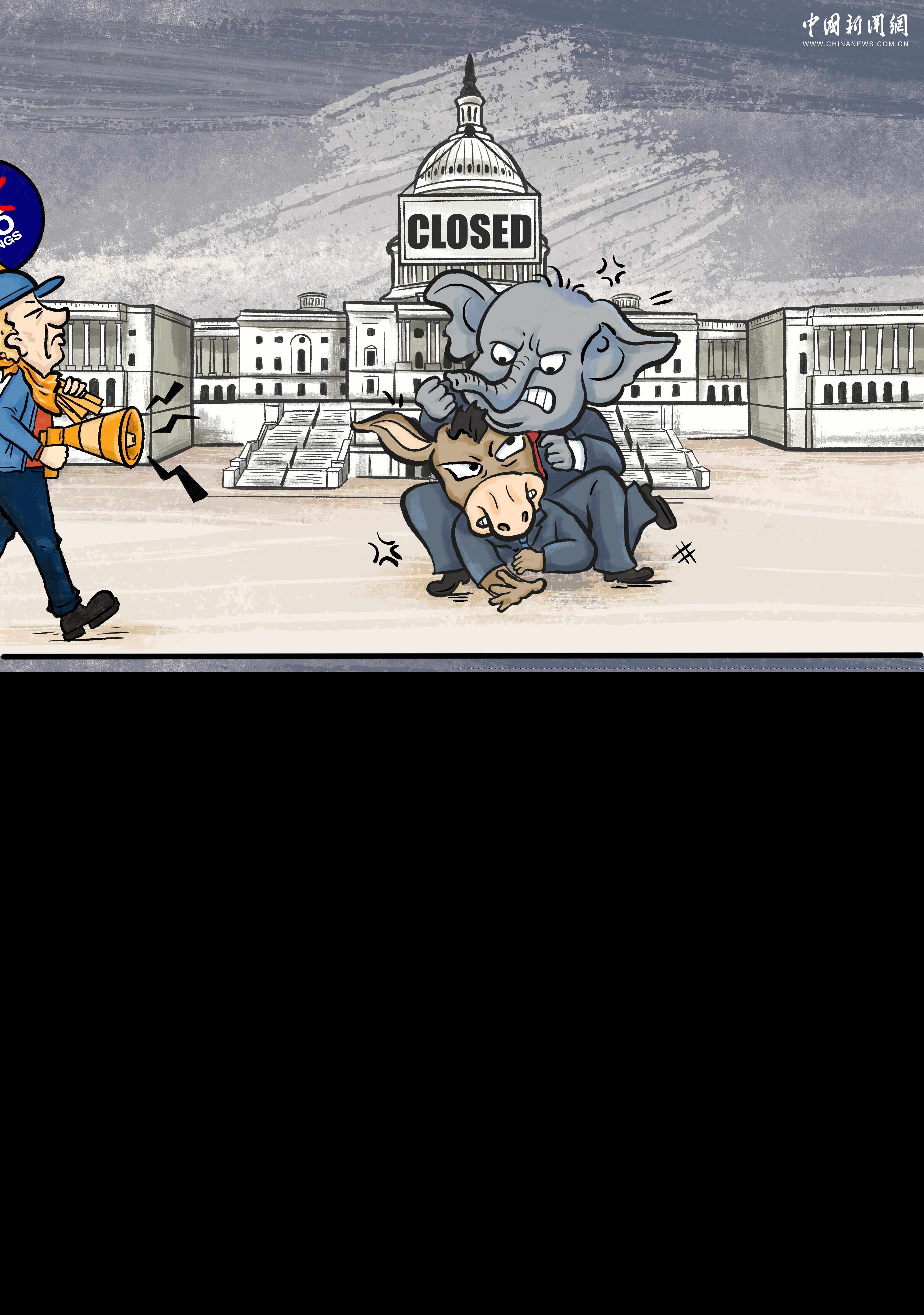连日来,从纽约到洛杉矶,抗议活动已走上美国2700多个城镇的街头。数百万人举着“禁止国王”的标语,反对特朗普政府采取的严厉移民政策、强制部署国民警卫队、提高关税等行政措施。这次全国性的示威活动是6月14日全国首次“无王”抗议活动的延续。在政治中心华盛顿,现实就像一幅“漫画”,不断展现出讽刺的场面:一边是席卷美国的舆论浪潮,一边是白宫门前无休无止的党派之争。所有这些都表明,幻想与现实、美国的政治原则与实践之间存在着巨大的脱节。当举着“无王”标语的人们不经意间传过时,打斗中的驴子和大象似乎短暂地停止了,他们震惊地意识到真正的问题不再是他们之间的胜负——而是联邦政府的大门挂着“关闭”的牌子,对沸腾的舆论关闭了。
