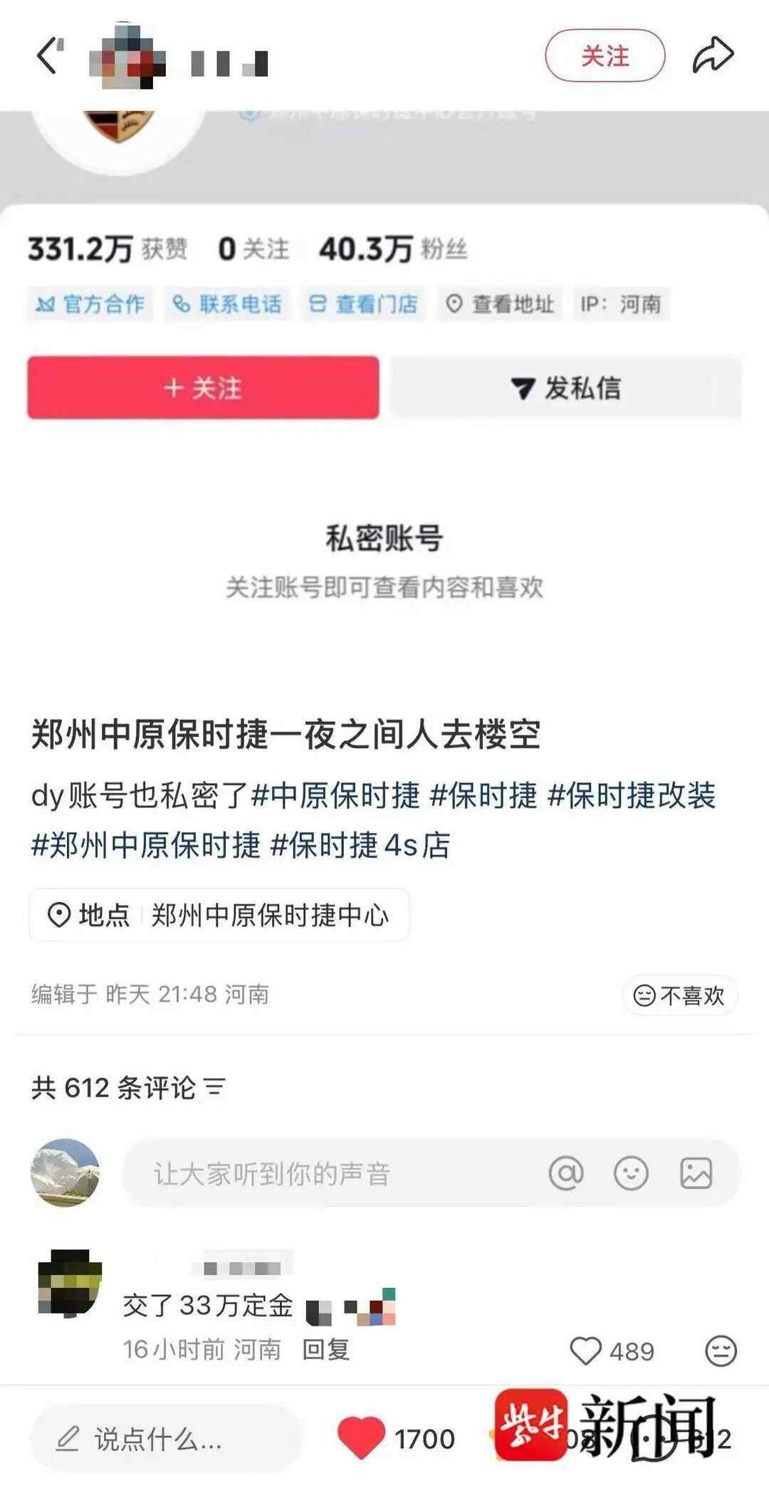 近日,记者注意到,12月23日晚,不少网友在社交媒体平台发帖称,位于郑州市中原区大中原国际汽车城的郑州中原保时捷中心疑似突然“跑路”。展厅里几乎空无一人,买家很难与销售人员互动。 12月24日下午,中原区商务局工作人员就此事回应记者表示,相关部门已成立专门小组,将初步介入调查筹划和协调工作。记者从近200人的车主维权小组了解到,本案中,金额为受影响买家的购车押金在2万元至数十万元不等;还有不少车主反映,他们从店里购买的“终身保养”套餐或其他预充值服务可能无法兑换,涉及金额达数万元。据媒体报道,该店销售顾问“小孟”向顾客发出的一封“致顾客的信”显示,12月22日,该店营业正常,当天不少顾客成功提车。 12月23日上午上班后,员工们发现公司大楼空无一人,员工们也没有最初的认识。一些客户支付的押金没有得到妥善处理,员工本身被拖欠工资和报销金额从几万元到几十万元不等。该说明还指出,“昨天提车的客户还没有“他们拿到了车辆证,将面临拿不到牌照的问题,但还得继续还债。”12月24日上午,记者多次拨打郑州中原保时捷中心公众号,发现无人接听。同时,记者以公民身份致电涉事保时捷中心辖区派出所。接听电话的工作人员表示,了解了相关情况,建议消费者通过法律途径维权。据初步了解,关店原因是经营不善导致资金链断裂 针对此事,保时捷中国客户服务中心回应称,已收到多位顾客询问,正在安排人员进一步核实情况,目前保时捷官方暂无其他信息可透露。官方小程序信息 24日下午,中原区商务局工作人员回应记者表示,相关部门已成立专门小组,正在初步介入处理该事件。由于事发突然,他们还在联系店家,与消费者核实具体情况。涉事保时捷中心官方运营账号信息显示,该店由郑州东宝润汽车销售有限公司运营。天眼查信息显示,该公司成立于2015年,注册资本6000万元。除了注册商店相关的电话号码外,还注册了私人手机号码。记者拨打该私人号码,询问是否是郑州东宝润汽车销售有限公司后,立即挂断。随后多次拨打电话均无人接听。天眼查工商变更信息显示,12月17日,郑州D昂宝润汽车销售有限公司发生高管变动:执行董事、总经理杜传涛卸任,尹绍良出任董事、经理,法定代表人由杜传涛变更为尹绍明确。公开资料显示,库公司为东安控股集团成员企业。记者多次拨打东安控股集团的公共电话,中原保时捷中心对应的分机接通后仅播放“谢谢,再见”的语音提示,但无人接听。天眼查信息源|扬子晚报/紫牛新闻